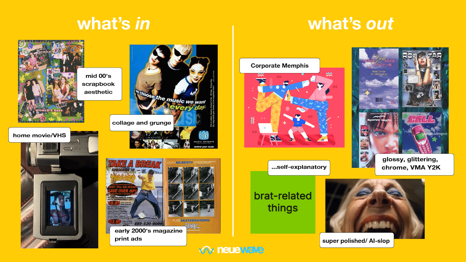When asked, our team is continuing to heavily favor messy, real, and retro aesthetics for 2026, but is hoping to trade the Y2K aesthetic, glitter pen aesthetics, to embrace the mid-00s scrapbook, home movie, and vintage magazine styles that are hard to replicate by AI.