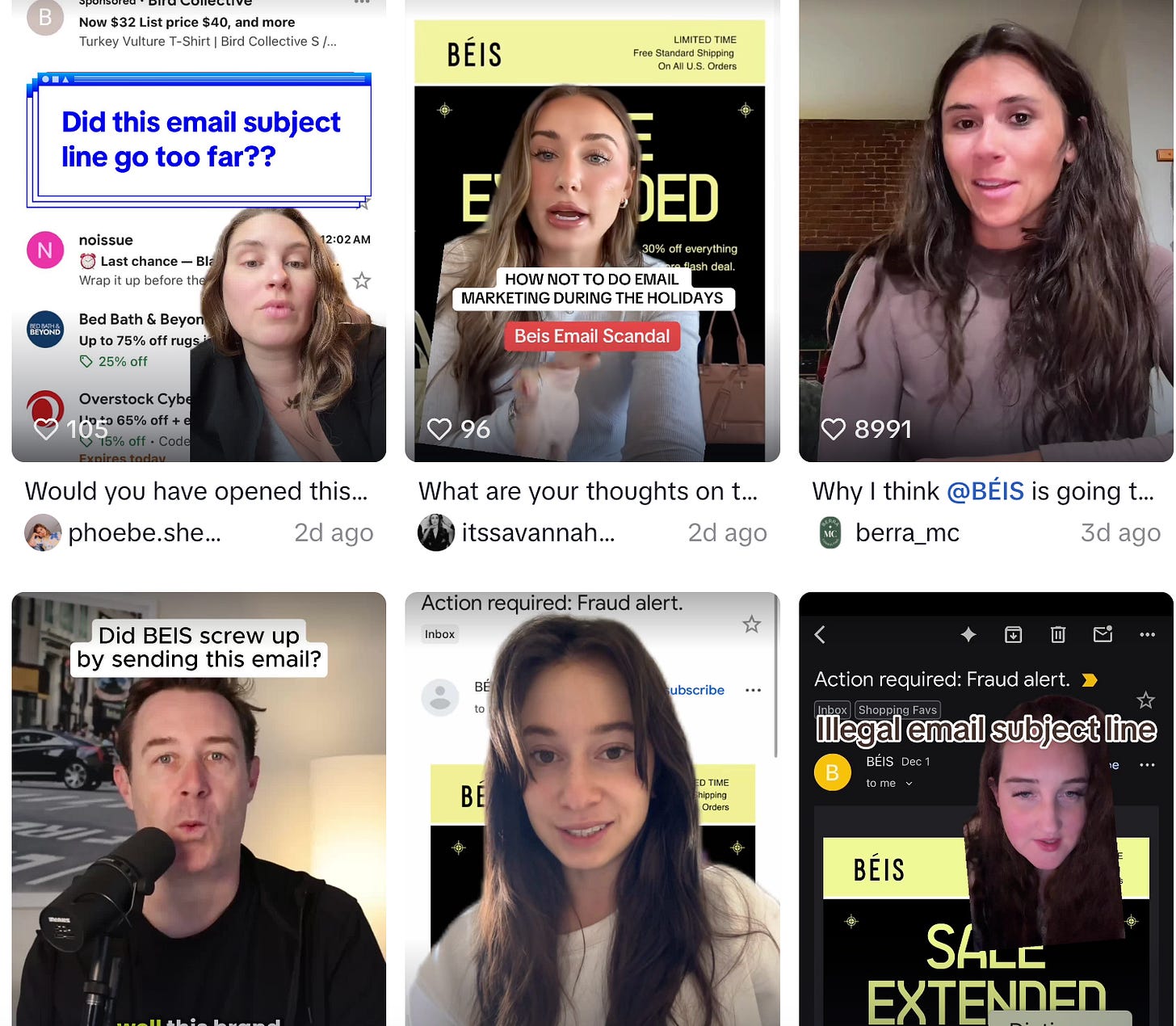 When a trend rooted in manipulation tactics for views and clickbait makes such an impact, it emboldens a brand to take it even further. Over Black Friday weekend, luggage brand Béis sent a marketing blast with the subject line “Action required: Fraud alert.”, in promotion of an extension of their holiday sale.