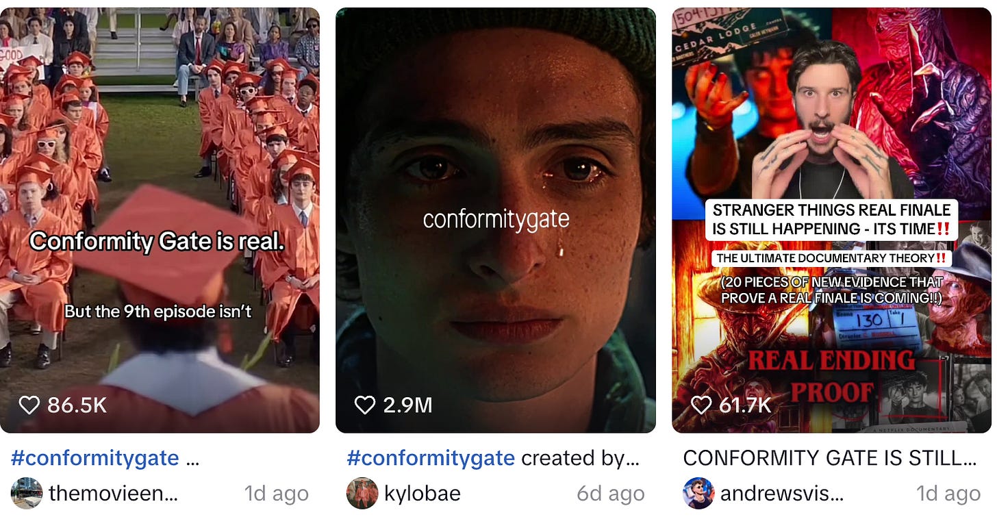 When the Stranger Things finale dropped on New Year’s Day, it triggered a mass psychological event known as “Conformitygate.” Large swaths of the audience simply refused to believe the “conforming,” happy ending was real, theorizing instead that the characters were trapped in a mass illusion induced by the villain, and a secret 9th episode would drop on January 7th to reveal the “truth.”
